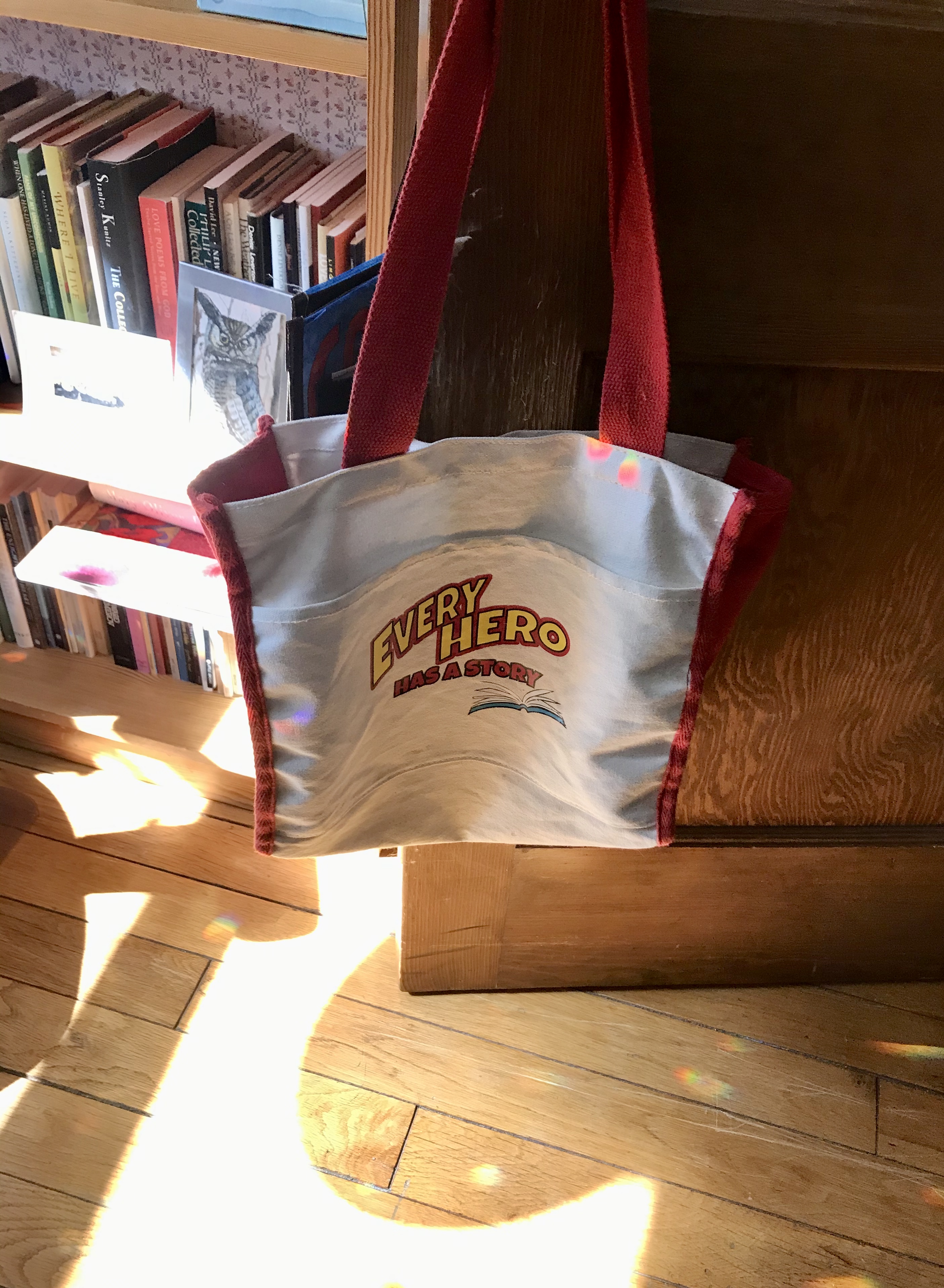 I then caught a glimpse of a tote bag that Beth had given me years ago, a bag I keep on a doorknob on the small reading room door. Flashes of rainbows from the prisms in the reading room window were bouncing off the bag. I stepped toward it to take a closer look at the small rainbows.