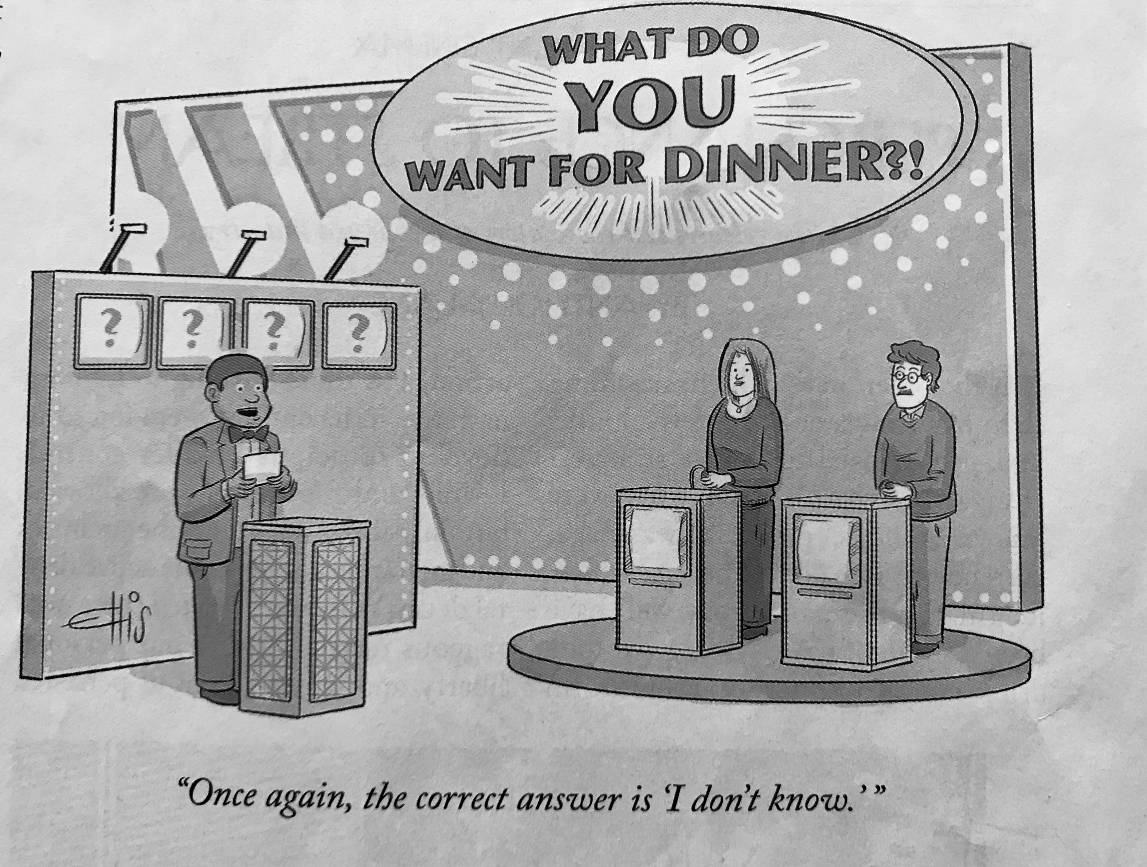 A good selection, so it’s difficult to choose. However, the second cartoon, “What do you want for dinner?”, in my experience should be changed to “What are we having for dinner?” The reply would remain, “I don’t know.”