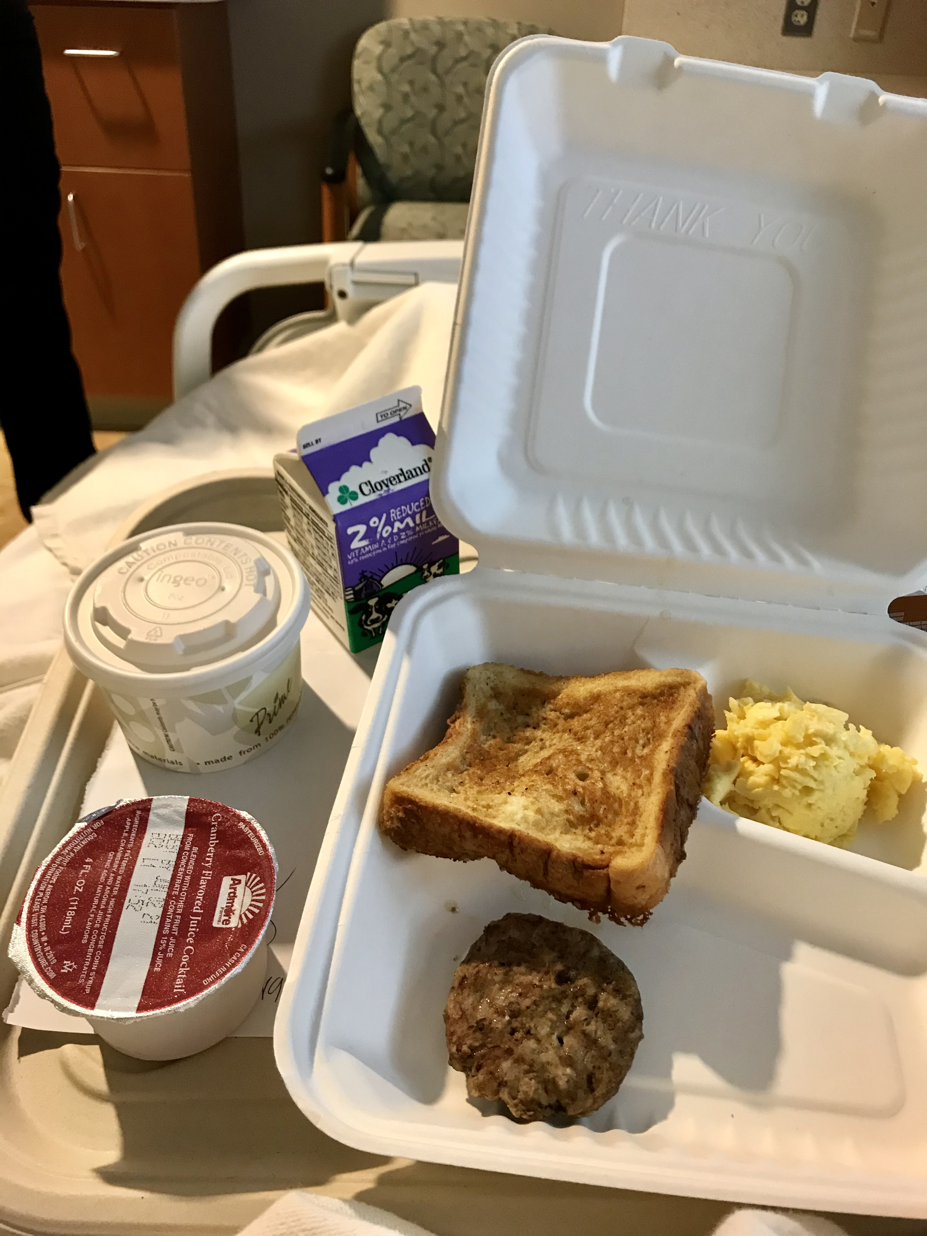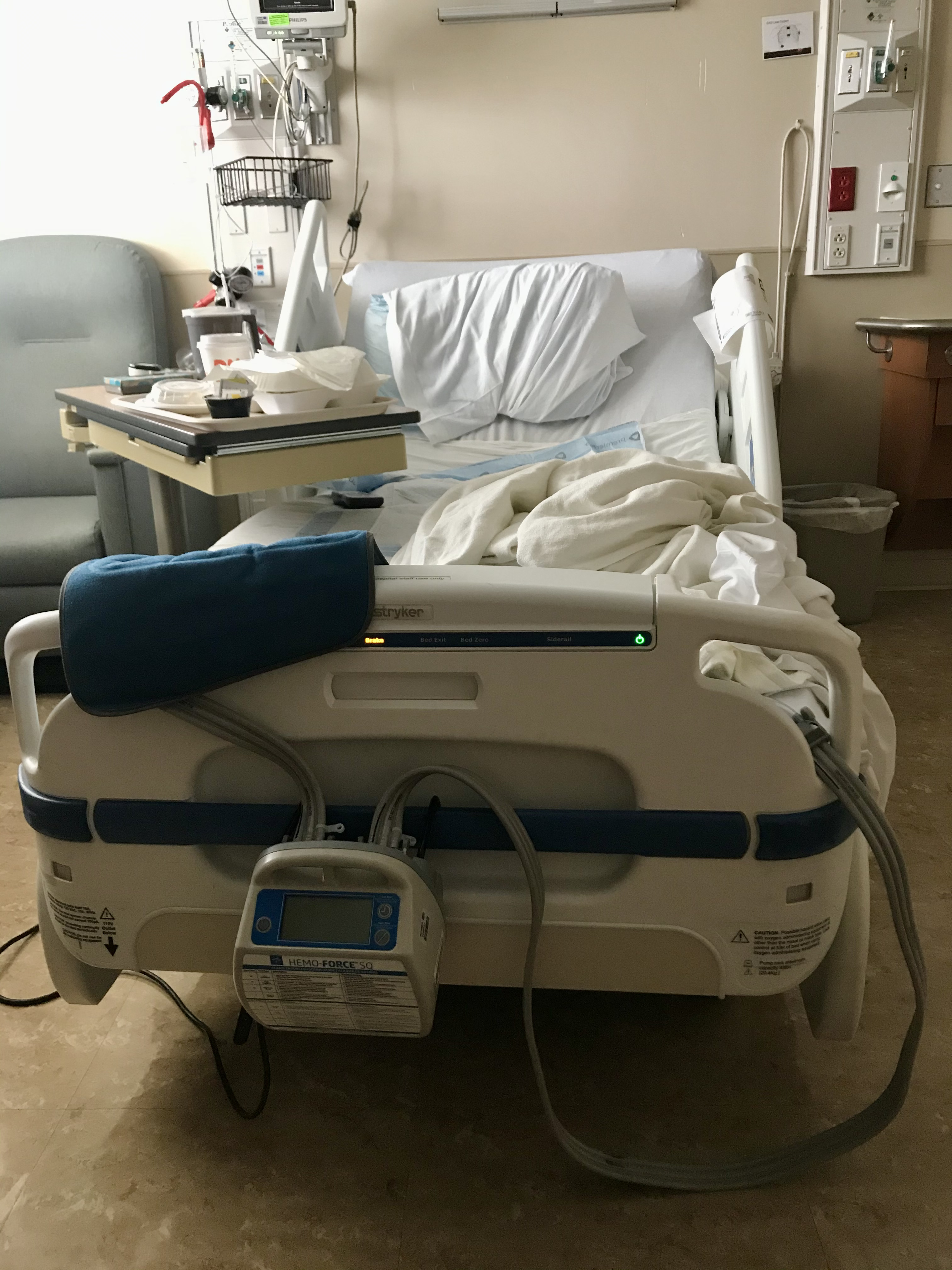Over the next several hours, IVs were inserted into both arms, more blood was taken and “sequential compression devices” were applied to my legs. “Think of them as leg massagers,” said my nurse, whose name was Cardia which means, “lover of the heart.” Seriously. I was also given what will go down in my life story as the worst breakfast I’ve ever had, though my nutritionist was lovely. Her name was — wait for it — “Angel.”