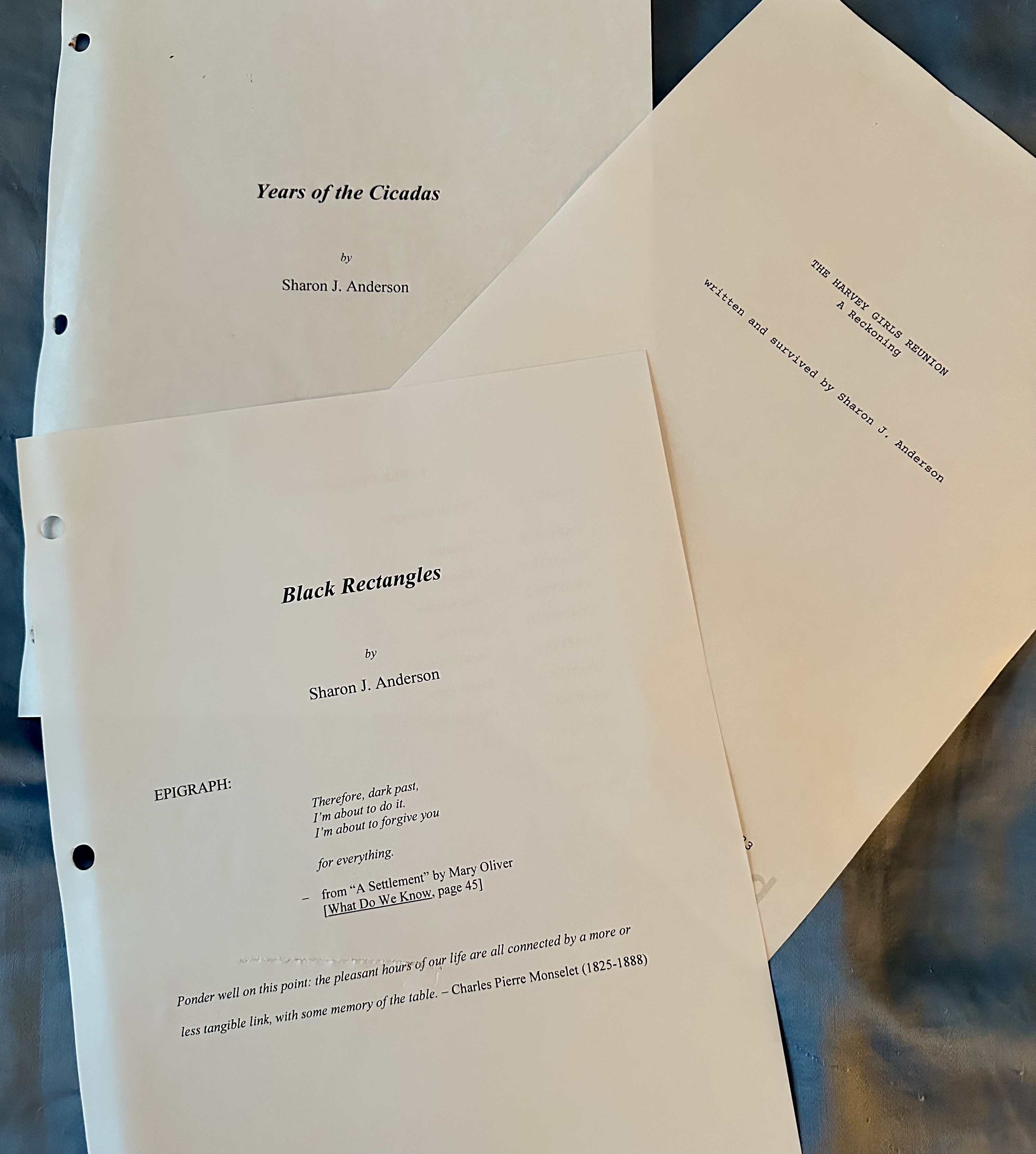 The first current are my attempts to write a memoir. Pictured here are the title pages of three separate drafts of a memoir: “Years of the Cicadas” begun in 1995 and abandoned after 100 pages; “Black Rectangles” begun in 2015 and abandoned after 240 pages; and “The Harvey Girls Reunion,” a memoir play begun in July 2023 and abandoned in October 2023 after 42 pages. There’s got to be SOME story there.