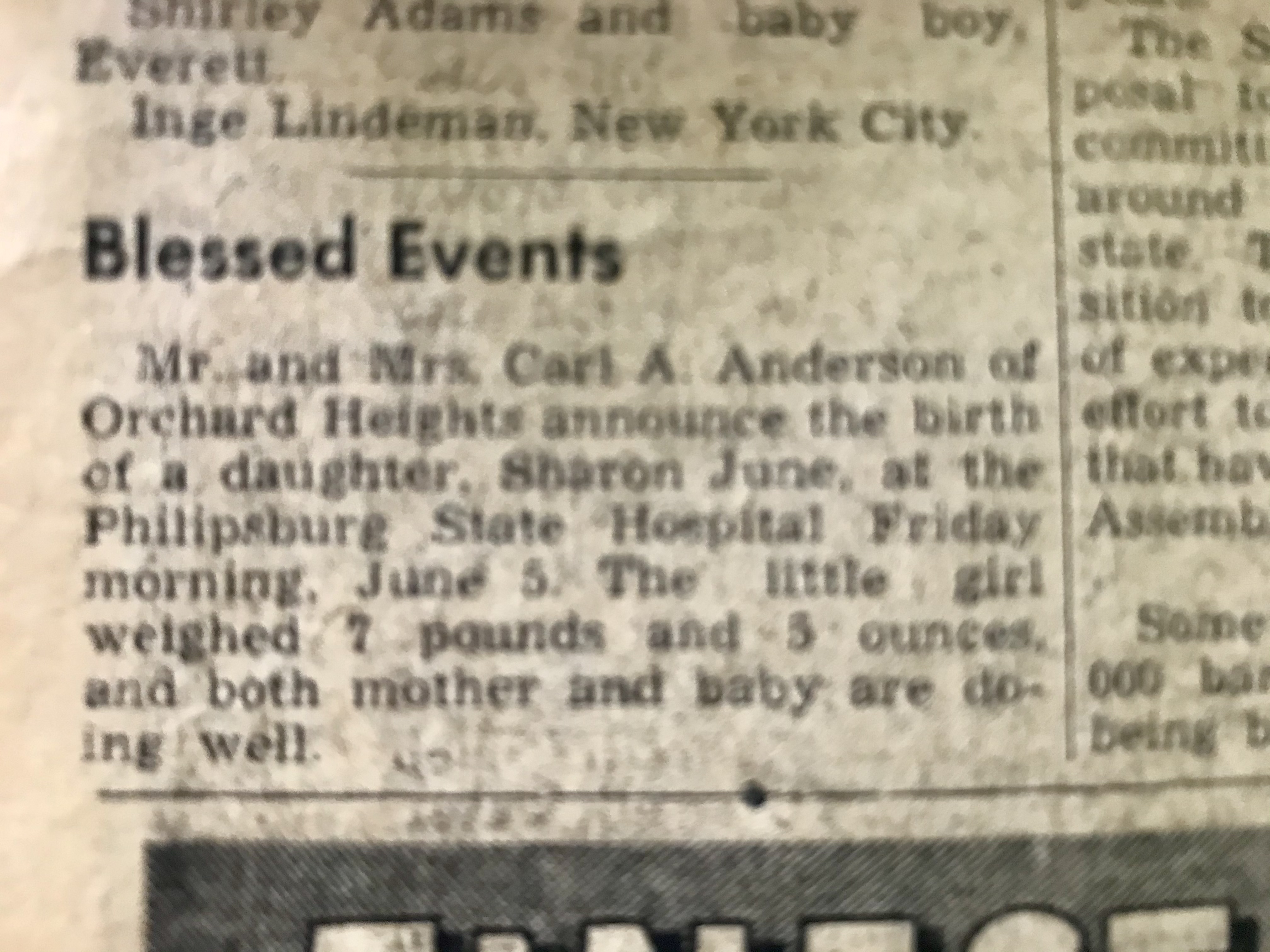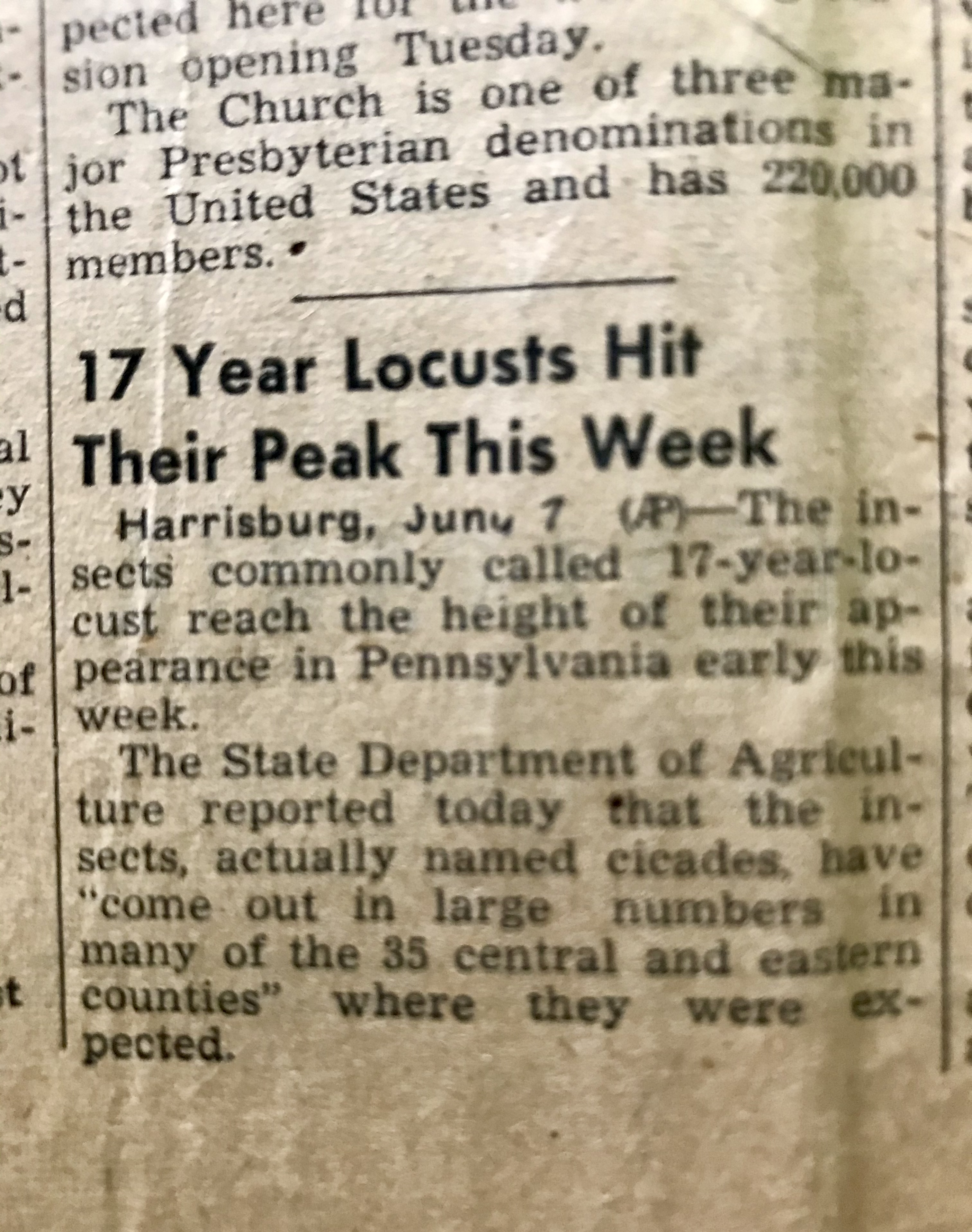 The day I was born — June 5, 1953 — the 17-year cicadas reached the height of their appearance in central Pennsylvania.  The news made the lower front page of the Bedford Daily Gazette three days later.  My appearance made page two of that same edition, though it was not listed under “Hospital Happenings” with two other births and several admissions and discharges. Instead, my birth was under a separate headline, “Blessed Events”: