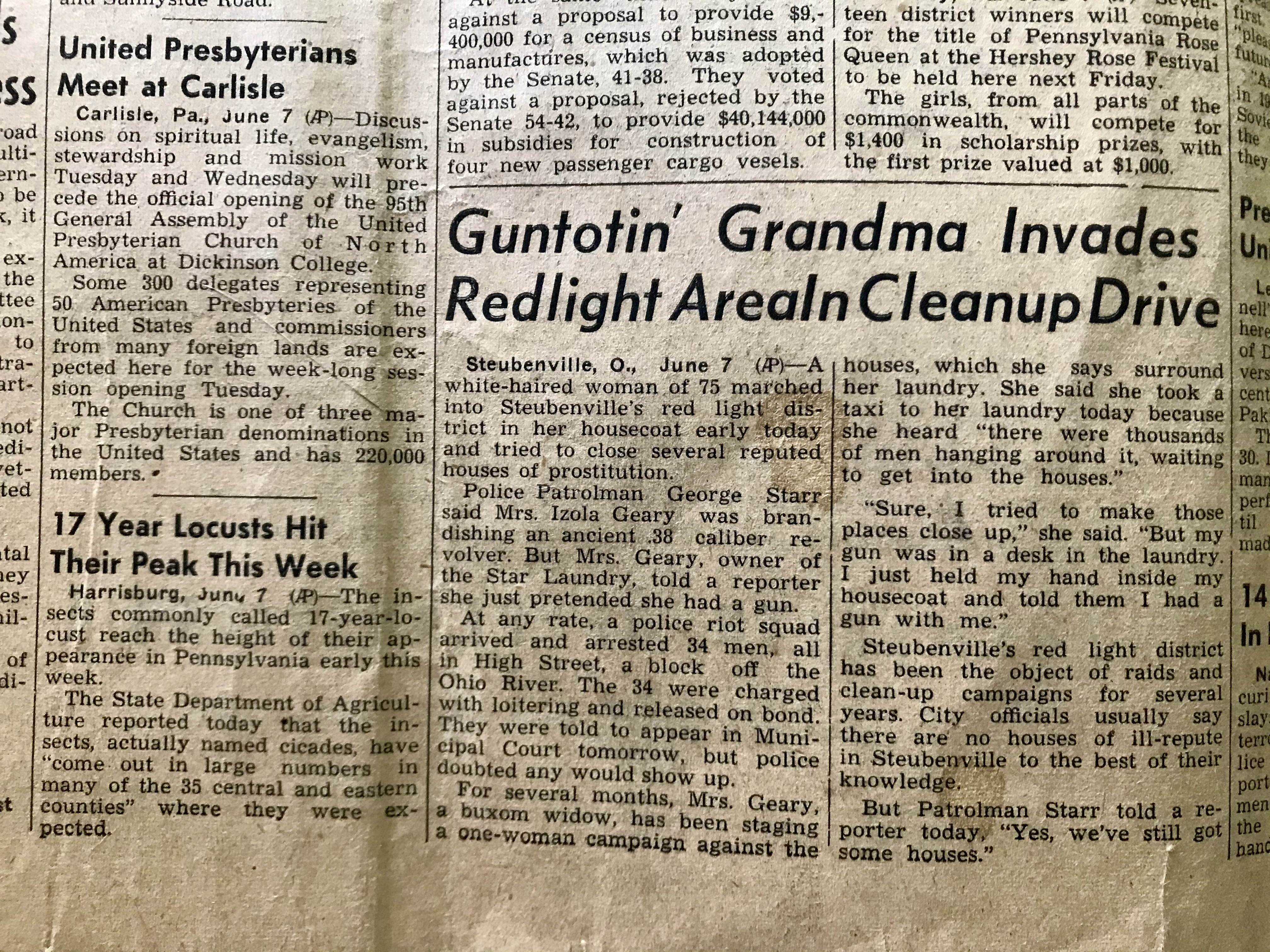 My mother saved the entire edition. My appearance as well as that of the cicadas was no doubt overshadowed by other front-page headlines: “Armistice Near in Korea War As U.N., Red Delegates Meet,” “Teachers Sorority Initiates Pearl Buck at Convention,” and, “Guntotin’ Grandma Invades Redlight Area in Cleanup Drive.”